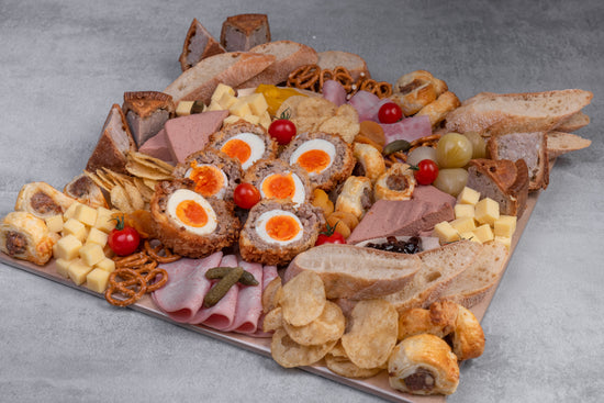 Example MenuAward winning pork pies, handmade herby sausage rolls, scotch eggs, pate, roast ham slices and cheddar cheese pieces.Teamed perfectly with pots of farmhouse pickle, crusty bread, crisp, pickled onions and pretzels.Complete on platter wrapped in cellophane ready to unwrap and display. Our platters are desing to fit inside a fridge we advise keeping your platter in the fridge or a cool place and remove 30 mins before enjoying!